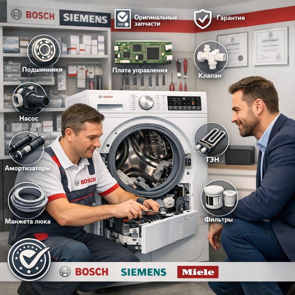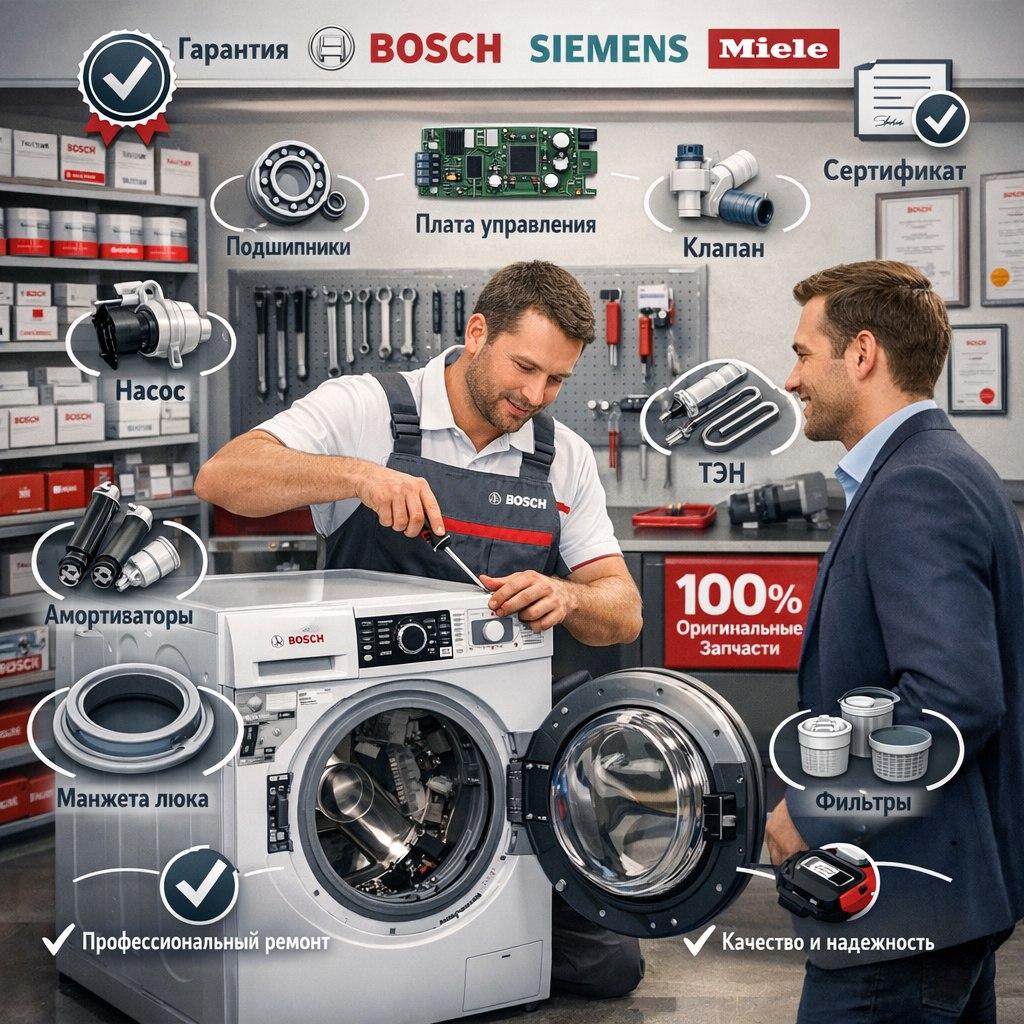 Ваша стиральная машина Bosch, Siemens или Miele вышла из строя? Доверьте ремонт профессионалам! Мы специализируемся на обслуживании техники премиальных немецких брендов, выполняем ремонт на дому с гарантией качества и использованием только оригинальных запчастей. Почему выбирают нас: • Сертифицированные мастера — опытные специалисты проходят регулярное обучение у представителей брендов и знают все нюансы разных моделей. • Оригинальные запчасти — ставим только подлинные комплектующие, что обеспечивает долгую и надежную работу техники. • Профессиональная диагностика — современное оборудование и точная оценка неполадок. • Прозрачные цены — согласуем стоимость до начала работ, никаких скрытых платежей. Выдаем официальный гарантийный документ. Как мы работаем: 1. Заявка онлайн или по телефону — работаем по всей Москве и Московской области. 2. Мастер приезжает в удобное время, проводит диагностику и согласует стоимость ремонта. 3. Оперативный ремонт на дому, строго по стандартам производителя. 4. Гарантия на выполненные работы и детали. Наши преимущества: • Выезд на дом — не нужно везти тяжелую технику в сервис-центр. • Работаем с частными и корпоративными клиентами. • Бесплатные консультации и всегда на связи! Виды работ: • Диагностика и ремонт электронных модулей • Замена подшипников, насоса, ТЭНа, клапанов подачи воды • Устранение протечек, восстановление электроники и электрики • Обслуживание моделей любого года выпуска Премиальный сервис — наш стандарт! Мы обеспечиваем аккуратность, пунктуальность и внимание к деталям. Ваша техника прослужит дольше — убедитесь сами! Оставьте заявку — мастер приедет в удобное для вас время! Быстро, надежно, с гарантией.